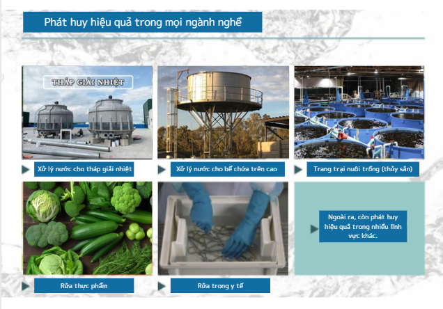 | Bệnh viện / cơ sở chăm sóc người cao tuổi | Khử khuẩn nước điều hòa, nước rửa tay, nước bồn tắm | Phòng chống lây nhiễm, nâng cao độ an toàn, tăng sự hài lòng của bệnh nhân |